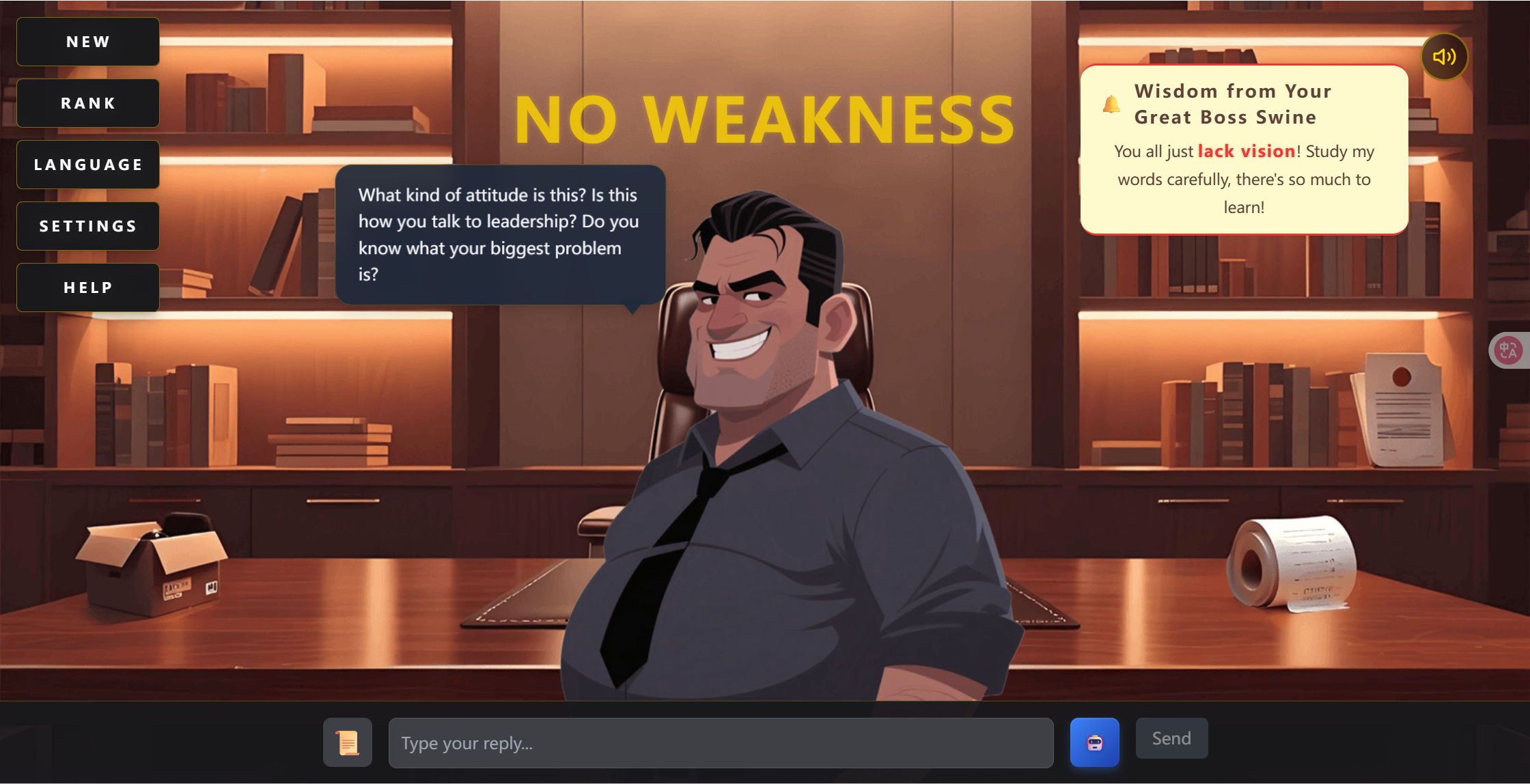This is an innovative AI-powered interactive puzzle game. You'll engage in real-time conversations with a 'boss' NPC driven by an advanced large language model. He's smart, he's cunning, and he'll use every corporate trick in the book to keep you down.
